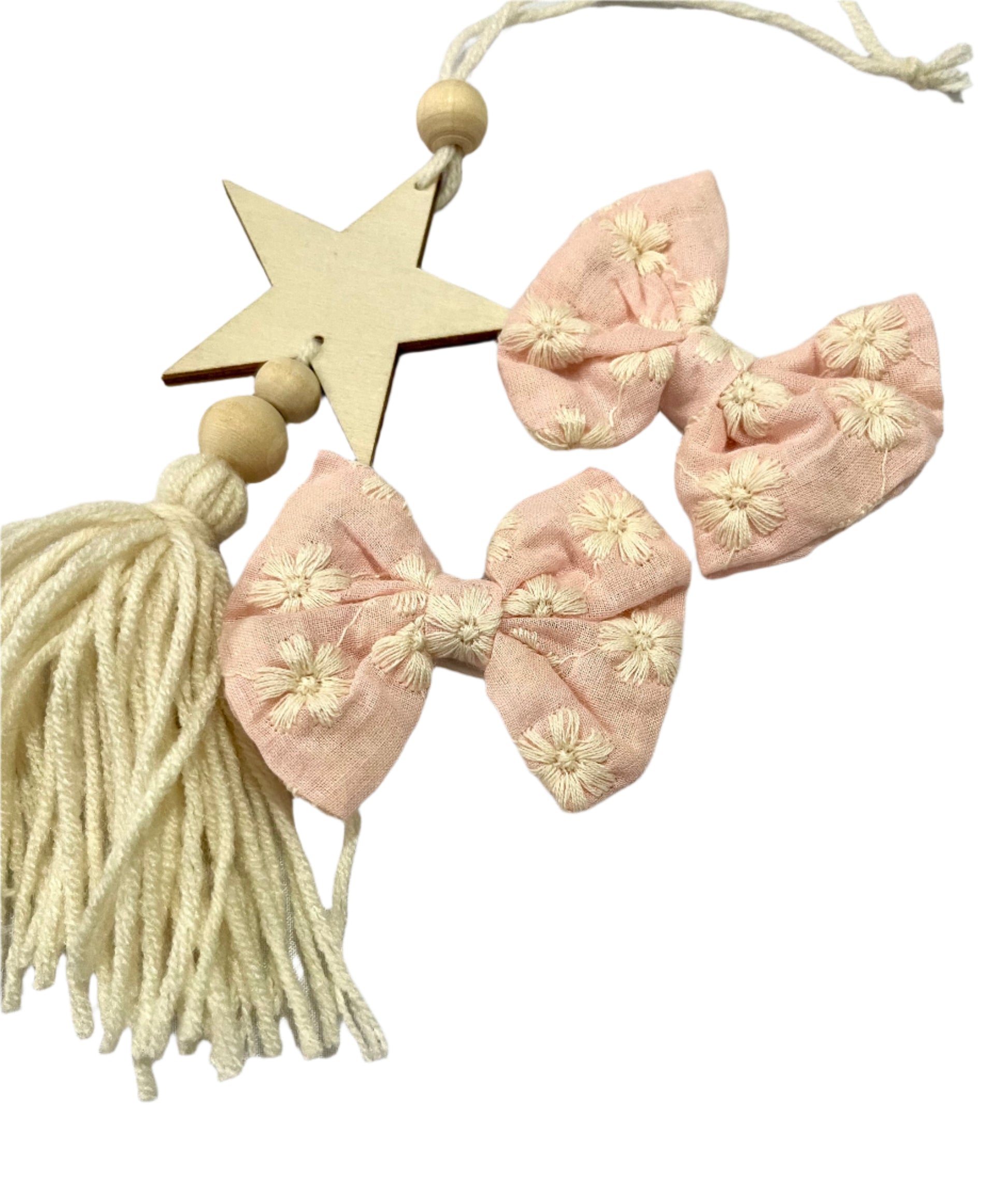 These Cute Pink Hair Clips showcase beautiful embroidered fabric detailing that adds a delightful touch to any hairstyle. The soft pink hue complements various outfits completed with alligator clip. These charming accessories are handcrafted with love and care.