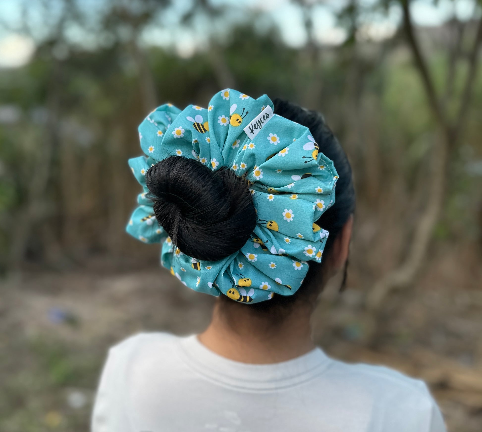 This oversized cotton scrunchie features adorable bee prints on a vibrant green background. Gentle on your hair while providing excellent hold, the Green Bee XXL scrunchie adds a touch of nature-inspired charm to any hairstyle. Perfect for everyday wear or adding a playful accent to your look.