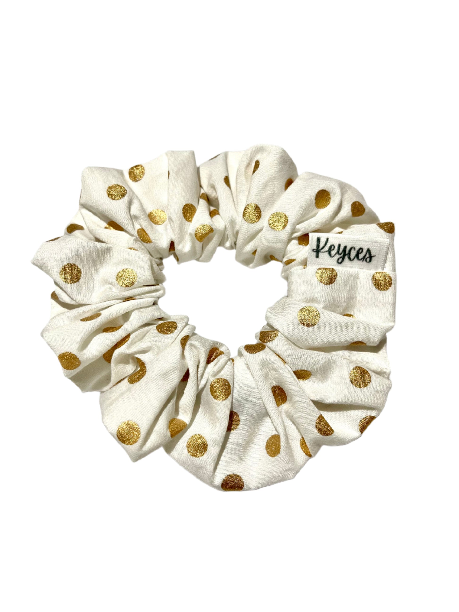 The Zariah MINI scrunchie features delicate golden polka dots on soft white fabric, adding a subtle touch of elegance to your hairstyle. Its compact size makes it perfect for securing small sections of hair comfortably without pulling. Ideal for everyday wear, it combines style and practicality to keep your hair neatly in place with a gentle hold.